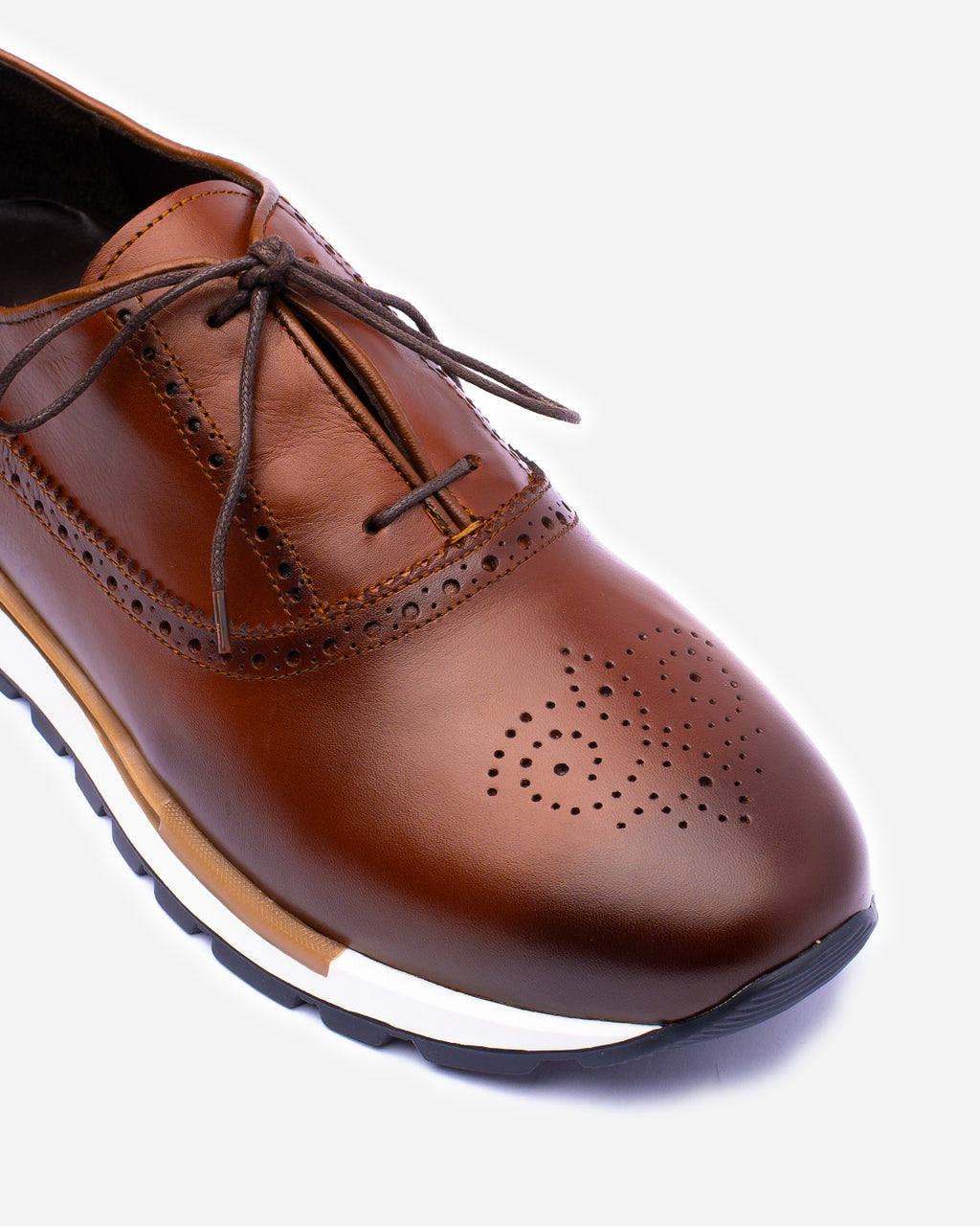 Le Chester Marron réinvente le derby classique avec une touche contemporaine. Confectionné en cuir lisse marron et rehaussé de fines perforations façon brogue, il repose sur une semelle en caoutchouc bicolore qui allie souplesse, confort et dynamisme.