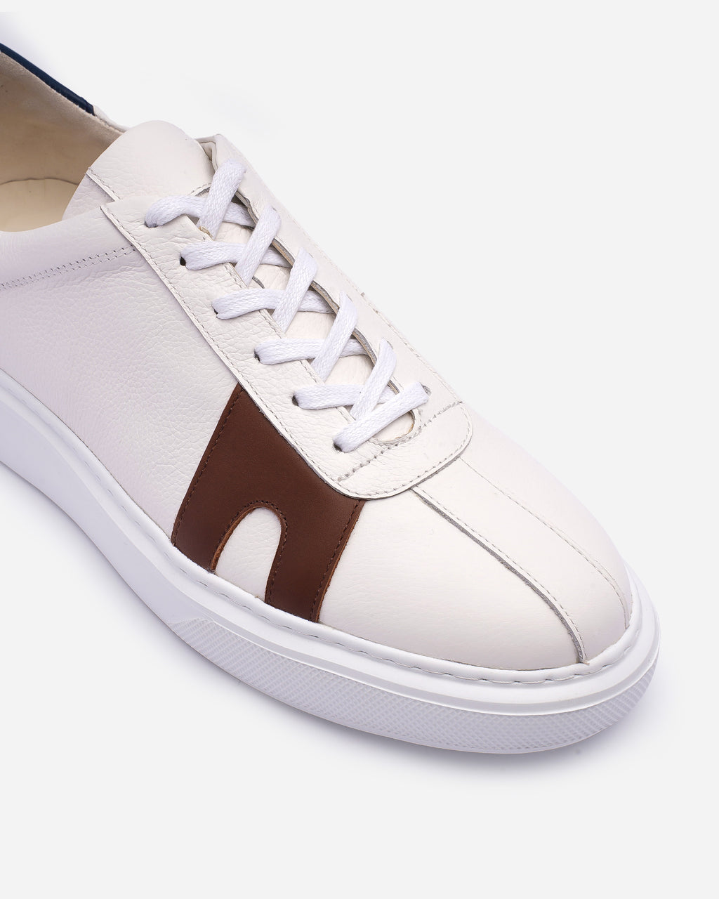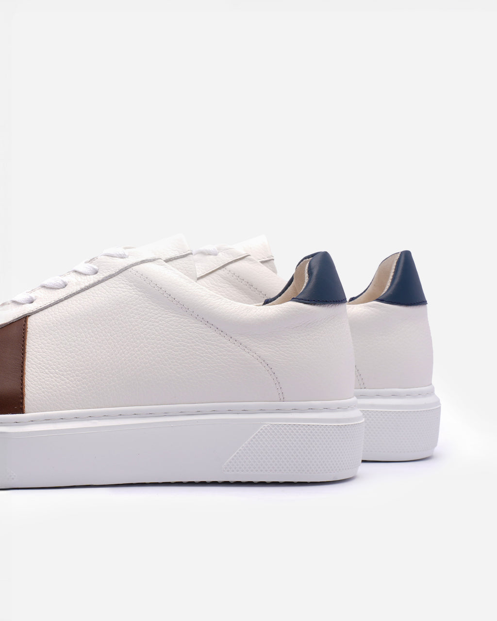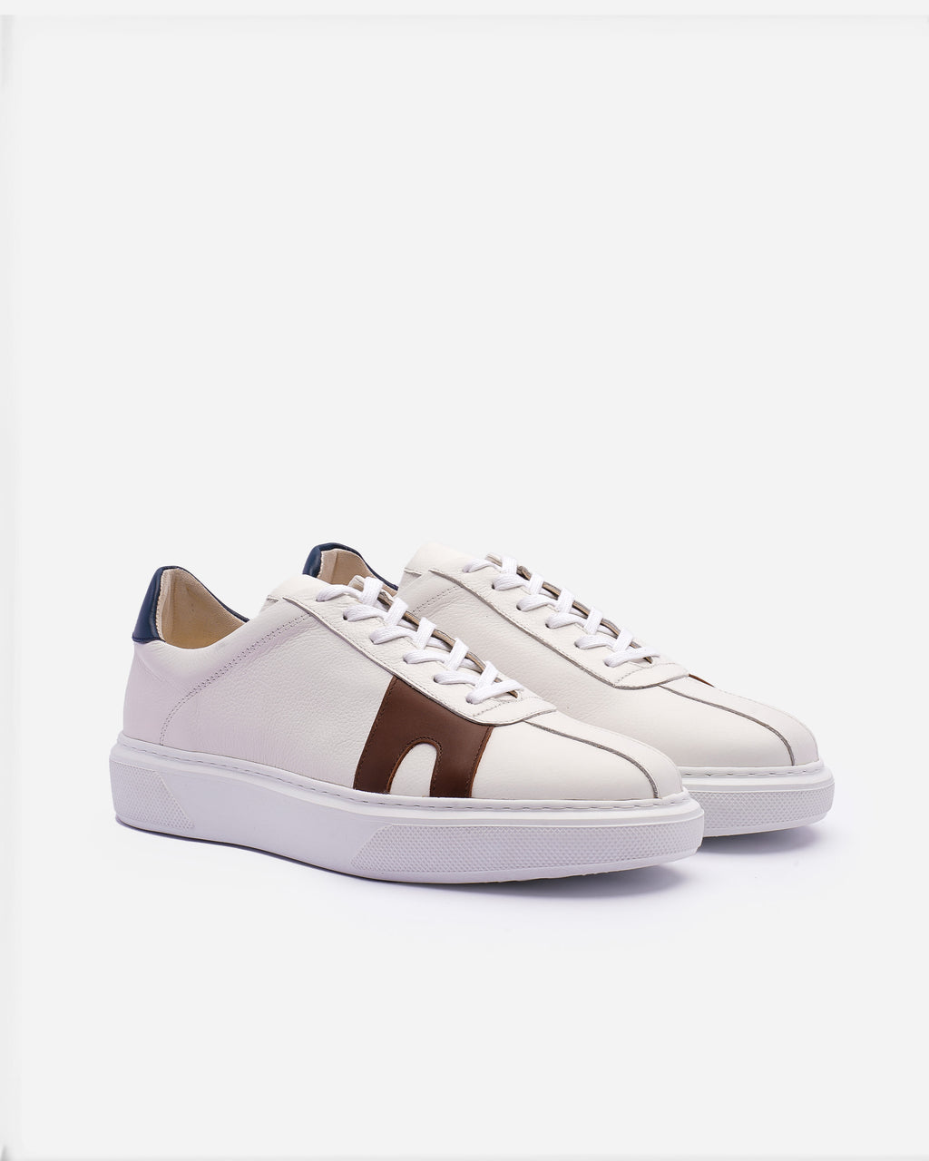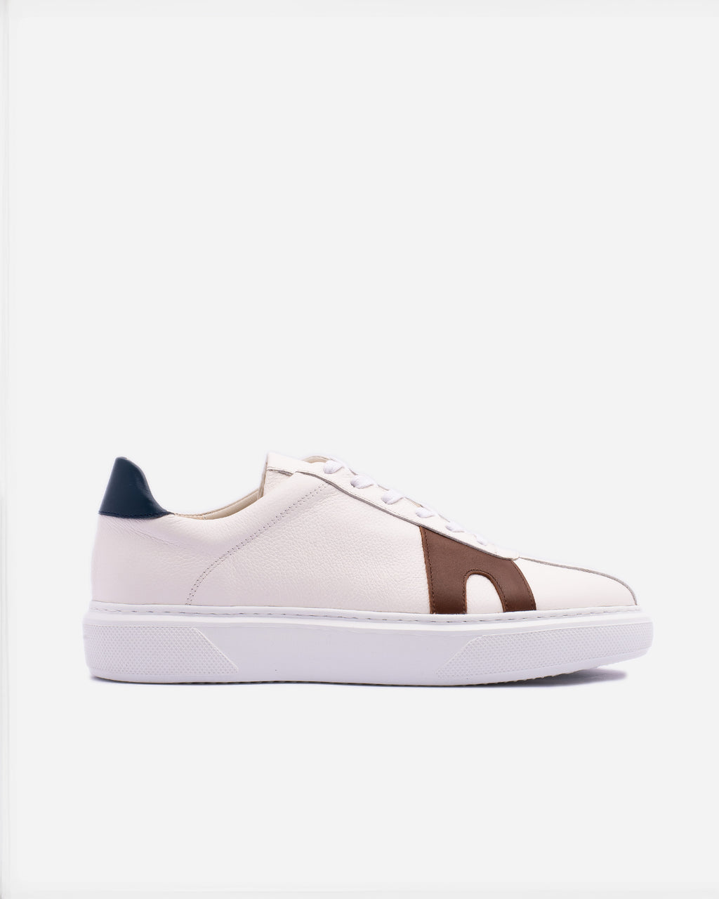 AvecOslo Bianco, la pureté scandinave s’invite dans le dressing masculin. Confectionnée encuir grainé blanc haut de gamme, cette sneaker urbaine joue avec les contrastes subtils :empiècement latéral marronettalon bleu nuitpour une identité visuelle élégante mais affirmée.